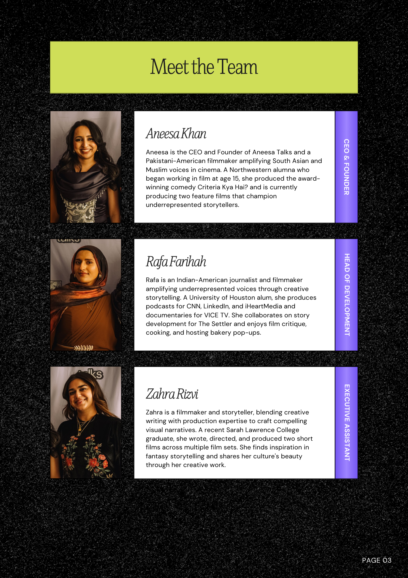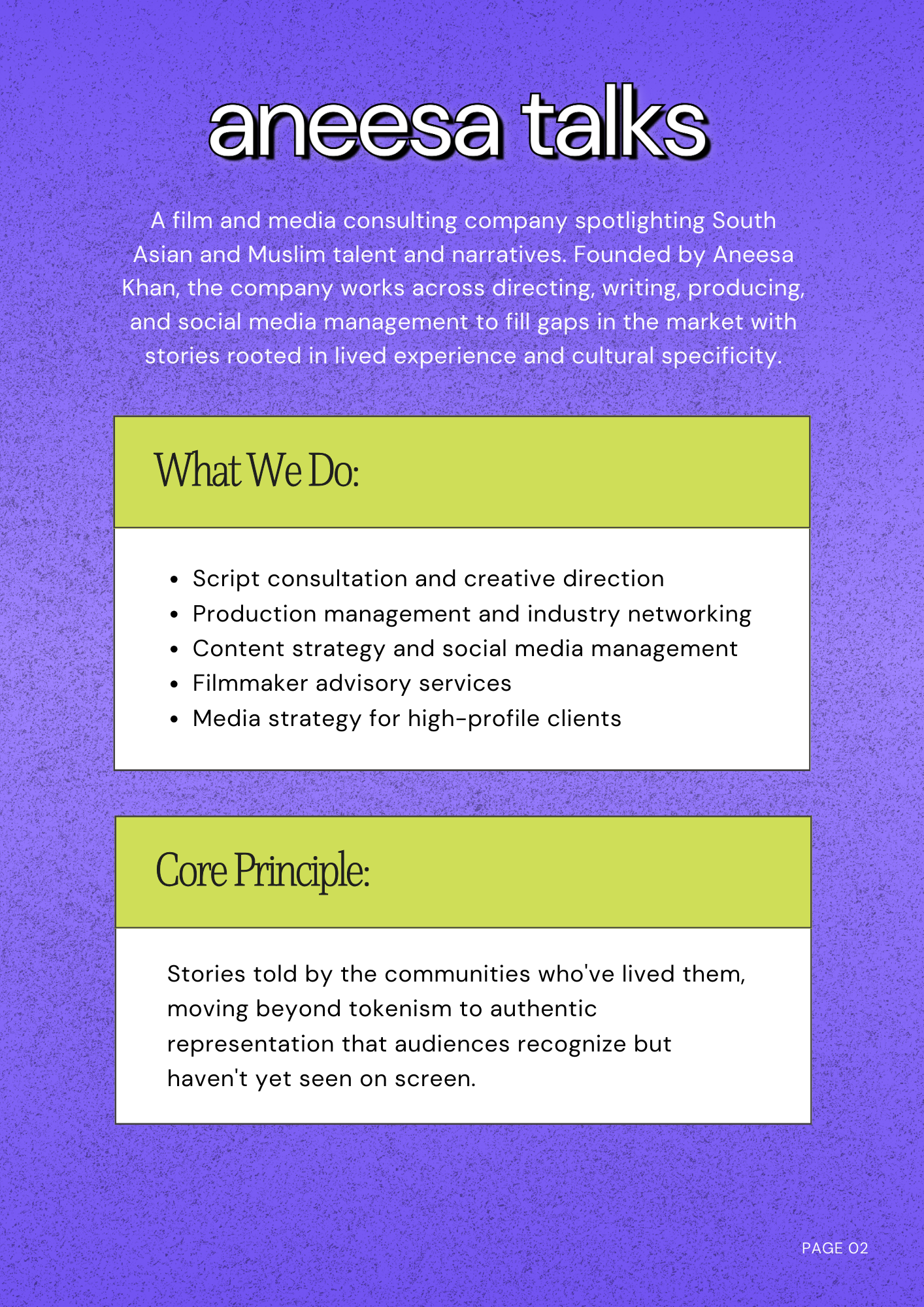 Created by filmmaker, producer, host, and media consultant Aneesa Khan, “Aneesa Talks” is a film consulting and production organization that creates and works on projects by underrepresented voices from the South Asian and Muslim creative community.