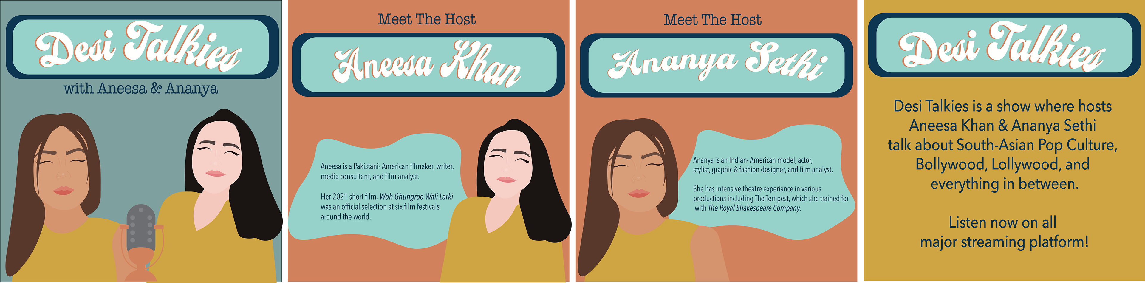 In our host’s first meeting, they talked about South Asian films, TV, and music for eight hours straight. Then, they instinctively decided to start a podcast together that would be targeted toward diasporic South Asians like them. Ananya and Aneesa’s respective careers cover the realm of the entertainment industry while also covering the dynamic of India-Pakistan.